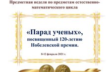В этом году предметная неделя посвящена 120-летию Нобелевской премии. Нобелевская премия — одна из наиболее престижных международных премий, ежегодно присуждаемая за выдающиеся научные исследования, революционные изобретения или крупный вклад в культуру, или развитие общества. В течение недели учащиеся знакомятся с наиболее известными российскими учеными, ставшими лауреатами Нобелевской премии.