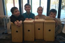 Ребята 1 А и 1 Б сделали своими руками скворечники, а потом их повесили на деревья.