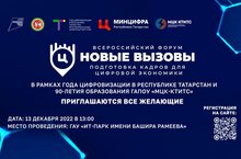 13 декабря, в рамках Года цифровизации в Республике Татарстан и по случаю 90-летия образования государственного автономного профессионального образовательного учреждения «Международный центр компетенций – Казанский техникум информационных технологий и связи», Министерством цифрового развития государственного управления, информационных технологий и связи Республики Татарстан состоится Всероссийский форум «Новые вызовы – подготовка кадров для цифровой экономики» с участием представителей законодательных и исполнительных органов власти Республики Татарстан.