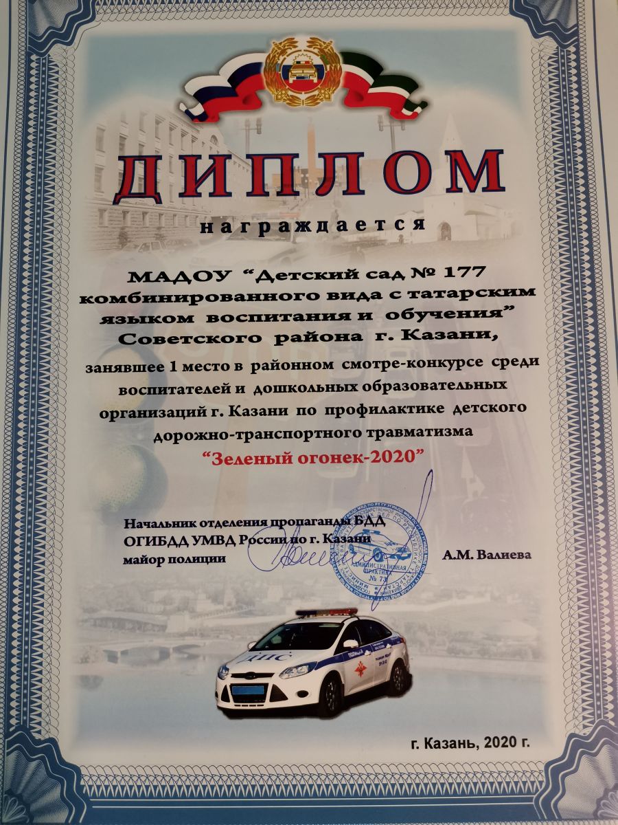 Награждается дипломом МБДОУ «Детский сад №177 комбинированниго вида» Советского района г. Казани занявшее 1 место в районном смотре-конкурсе среди воспитателей и дошкольных образовательных организаций г.Казани по профилактике детского дорожно-транспортного травматизма "Зеленый огонек 2020"