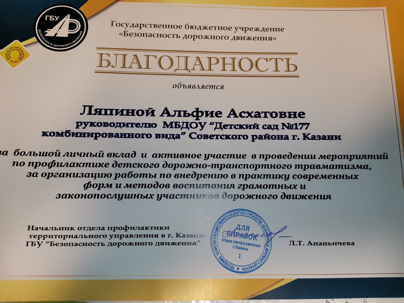 За активное участие в проведении мероприятий по профилактике детского дорожно-транспортного травматизма, за организацию работы по внедрению в практику современных форм и методов воспитания грамотных и законопослушных участников дорожного движения объявляется Благодарность заведующему МБДОУ «Детский сад №177» Ляпиной А.А. от Государственного бюджетного учреждения «Безопасность дорожного движения».