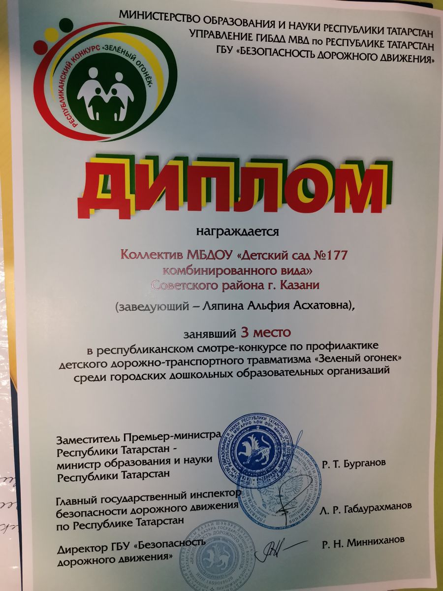Награждается дипломом коллектив МБДОУ «Детский сад №177» Советского района г. Казани занявшим 3 место в республиканском смотре-конкурсе по профилактике детского дорожно-транспортного травматизма «Зелёный огонёк» среди городских дошкольных образовательных организаций