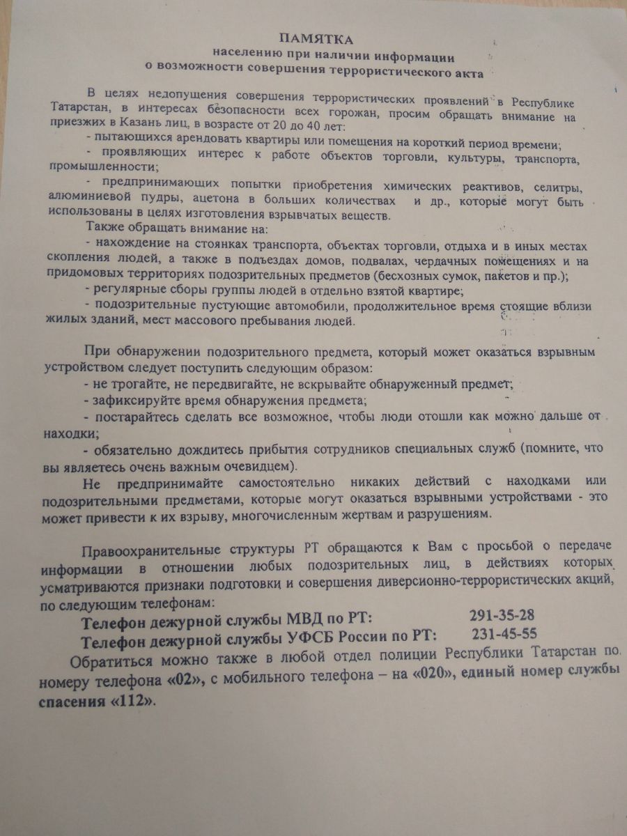 Памятка населению при наличии информации о возможности совершения террористического акта