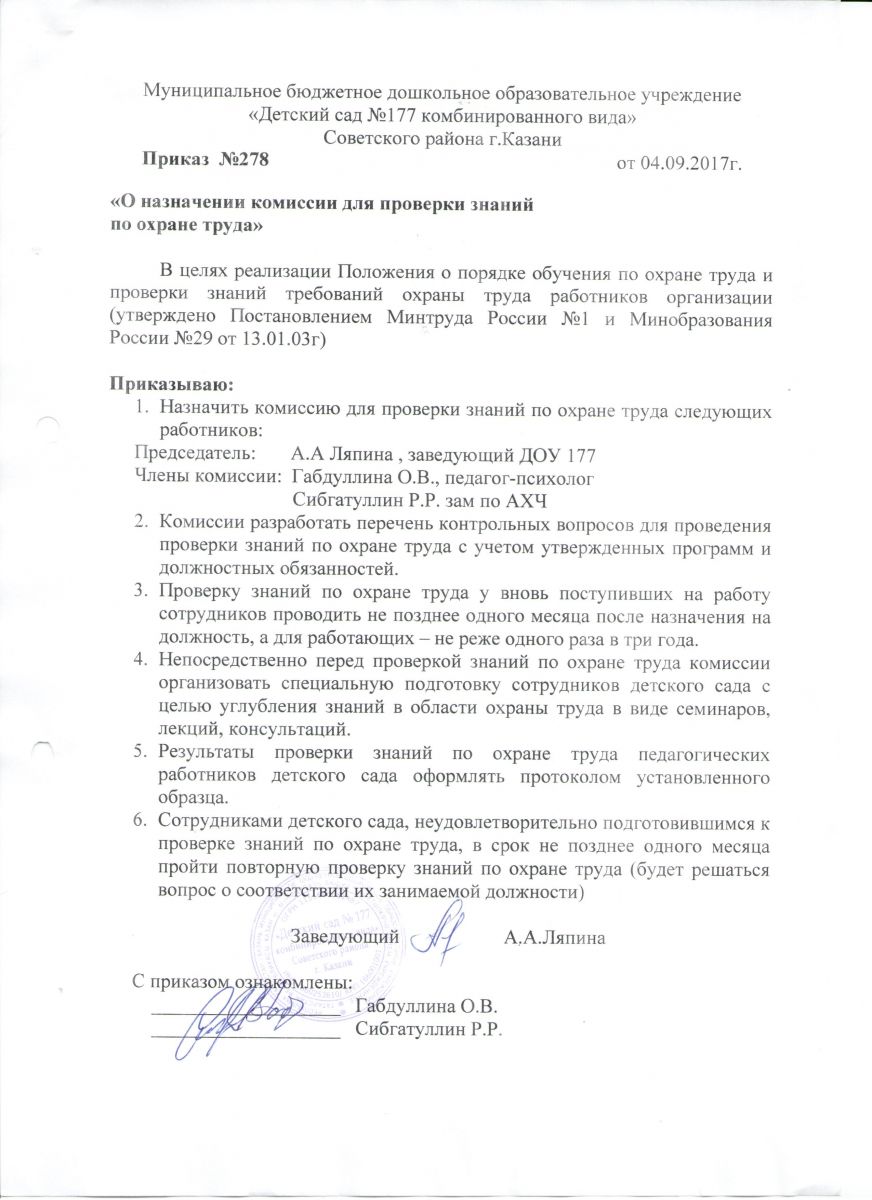 Приказ о назначении комиссии для проверки знаний по охране труда