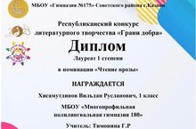 Поздравляем наших юных учащихся с очередной победой! Ученики 1Г класса Вильдан Хисамутдинов и Валерия Крысина стали Лакреатами Республиканского конкурса литературного творчества "Грани добра". Вильдан занял I место , а Валерия III место! Желаем дальнейших успехов!