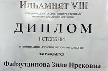 Поздравляем Зилю Файзутдинову (рук.Айсина Ч.И.,Идиятуллина А.Р) с победой в Международном онлайн конкурс-фестивале речевого и вокального искусства «Илһамият»!
