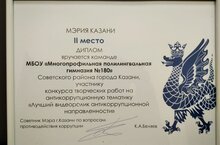 Казан шәһәре Муниципаль берәмлегенең башкарма комитеты, мәгариф идарәсе комитеты тарафыннан “Коррупциягә каршы көрәш”дип исемләнгән иң яхшы видеоролик бәйгесе үткәрелде. Гимназиябезнең 10-11 нче сыйныф укучылары “Экзамен - Имтихан” видеоролигын тәкъдим иттеләр. Шәһәр күләмендә II урын алдылар. Без-җиңүчеләр!!! Укучыларны,видеорлик режиссёры Насур Андарович Юрушбаевны, оператор Азат Сәмигуллинны, картина җитәкчесе Лилия Хәмбәлевнаны җиңүләре белән котлыйбыз.