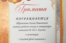 Сегодня, 6 марта в нашей гимназии прошла церемония награждения лучших учителей «Гимназия 183». В номинации «Золотой фонд гимназии» за развитие интеллектуальных, творческих способностей учащихся и за весомый вклад в общекультурное развитие образовательной среды была награждена учитель родного (татарского) языка и литературы Ибрагимова Л.Р. Поздравляем!