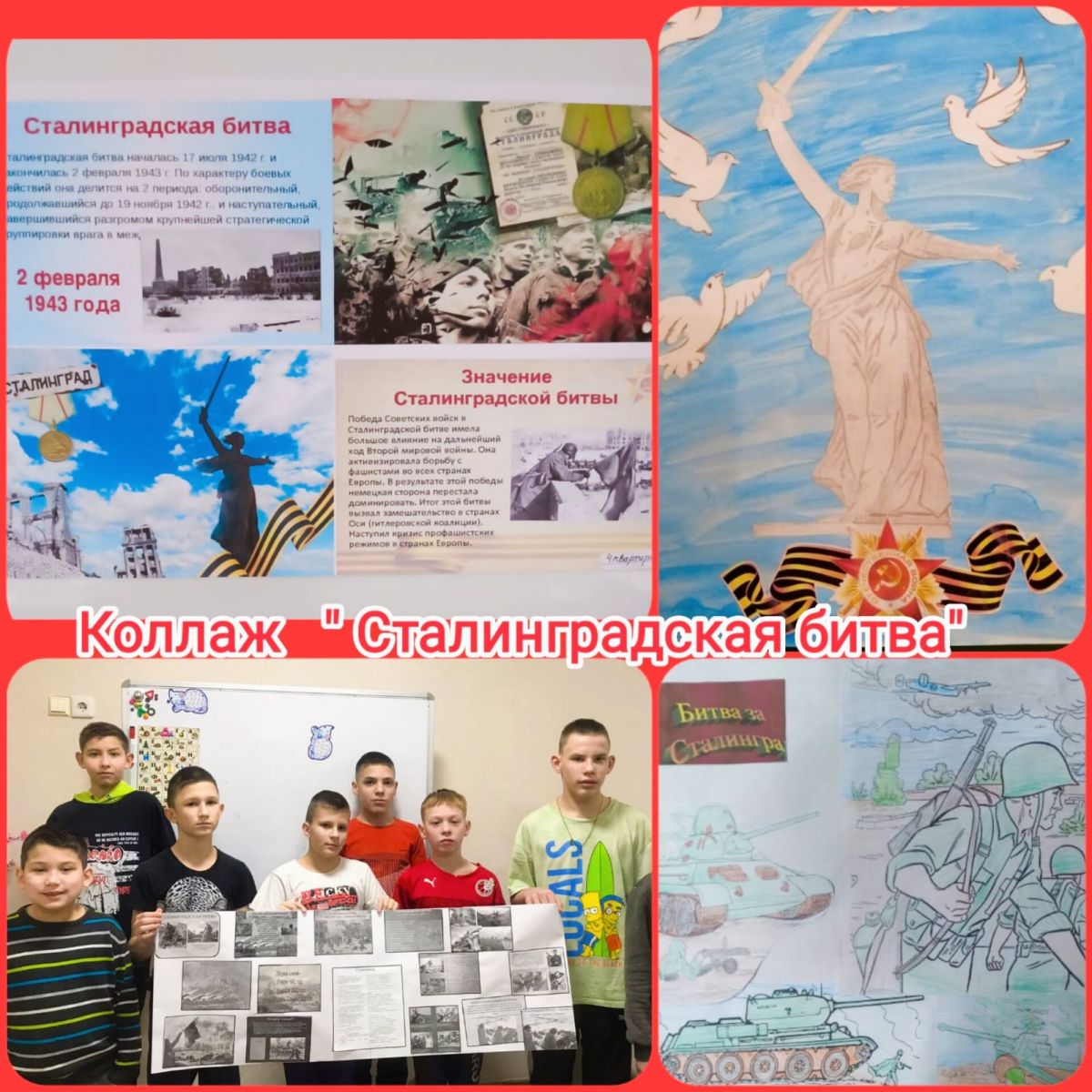 Опубликовано: 31.01.202331.01.23 дети школы- интерната 11 сделали коллаж,посвященный Сталинградской битве.02 февраля 2023 г. вся страна отмечает 80- летие Победы советских войск над немецко- фашистскими захватчиками в Сталинградской битве.