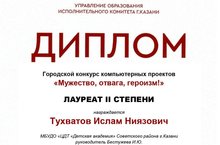 Учащиеся объединения "Родное слово", под руководством педагога Бестужевой И.Ю., приняли участие в Городском конкурсе компьютерных проектов "Мужество, отвага, героизм!". По итогам конкурса Тухватов Ислам получил диплом лауреата II степени. Поздравляем с победой, желаем дальнейших творческих успехов!