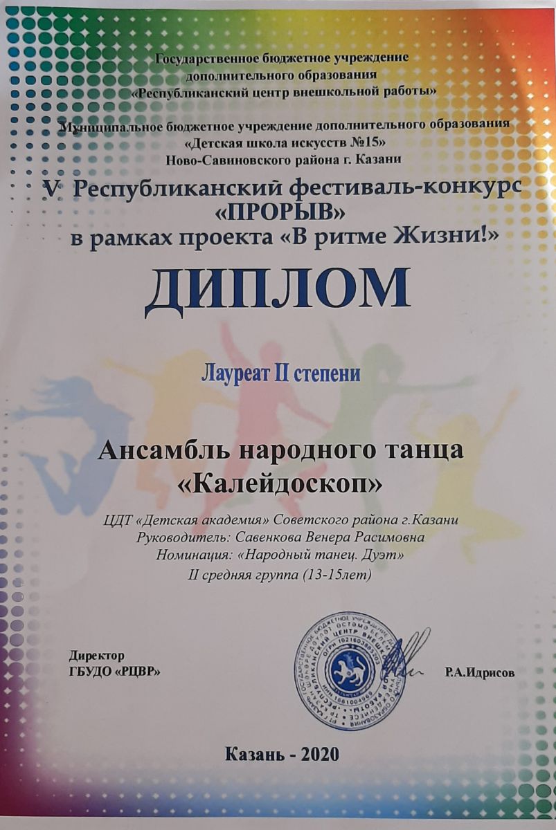 Опубликовано: 19.02.2021Хореографический ансамбль «Калейдоскоп» принял участие в V Республиканском фестивале - конкурсе «Прорыв» в рамках проекта «В ритме жизни». И стали Лауреатами II степени. Поздравляем ребят и педагога Савенкову Венеру Расимовну. Желаем дальнейших побед!