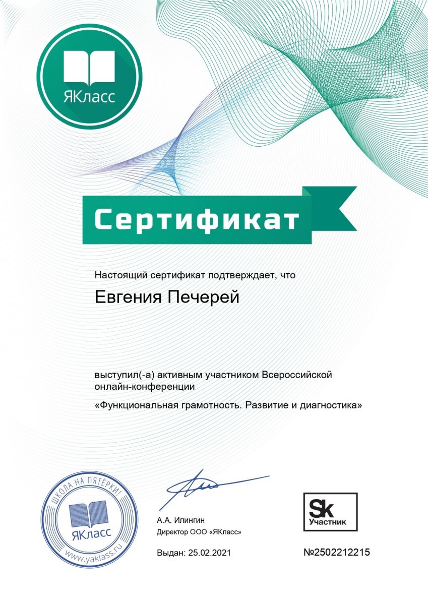 Опубликовано: 01.03.2021Печерей Е.П. выступила активным участником Всероссийской онлайн – конференции «Функциональная грамотность. Развитие и диагностика.»