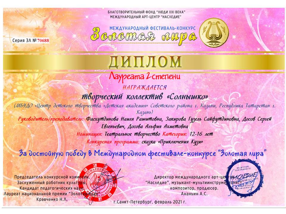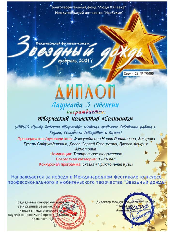 Опубликовано: 05.03.2021Обучающиеся хореографической студии «Солнышко» приняли участие в Международном фестивале – конкурсе « Звездный дождь». В Международном фестивале – конкурсе «Золотая лира». И стали Лауреатами третей и второй степени. Поздравляем наших ребят и педагогов с победой!