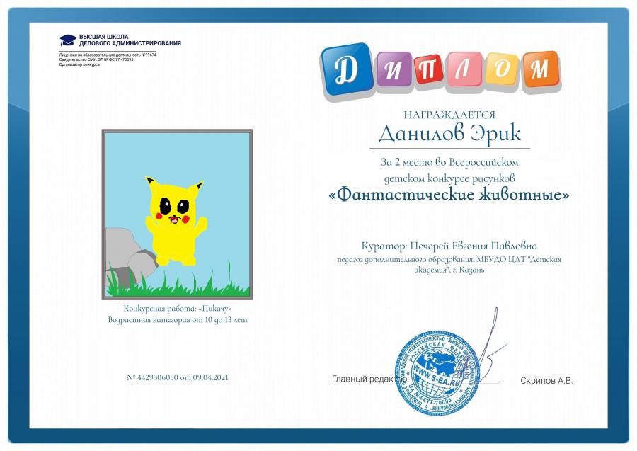 Опубликовано: 13.04.2021Обучающиеся школы компьютерной грамотности принимали участие во Всероссийском детском конкурсе рисунков «Фантастические животные» и заняли почетное второе место
