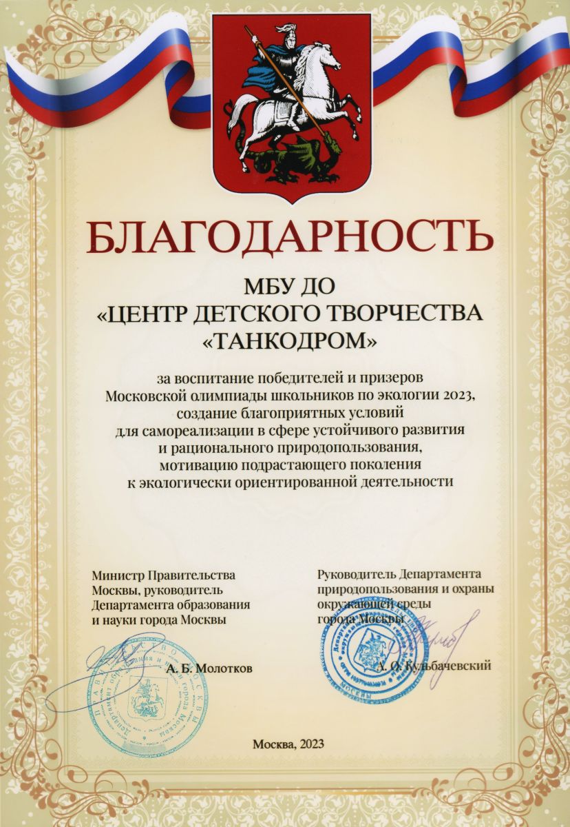 Благодарность получил МБУДО "Центр детского творчества "Танкодром" за воспитание победителей и призёров Московской олимпиады школьников по экологии-2023. Олимпиада проходит для учеников 5-8 классов с 2018 года. С 2020 года соревнование проводится и для старшеклассников. Олимпиада состоит из двух этапов: отборочного и заключительного.