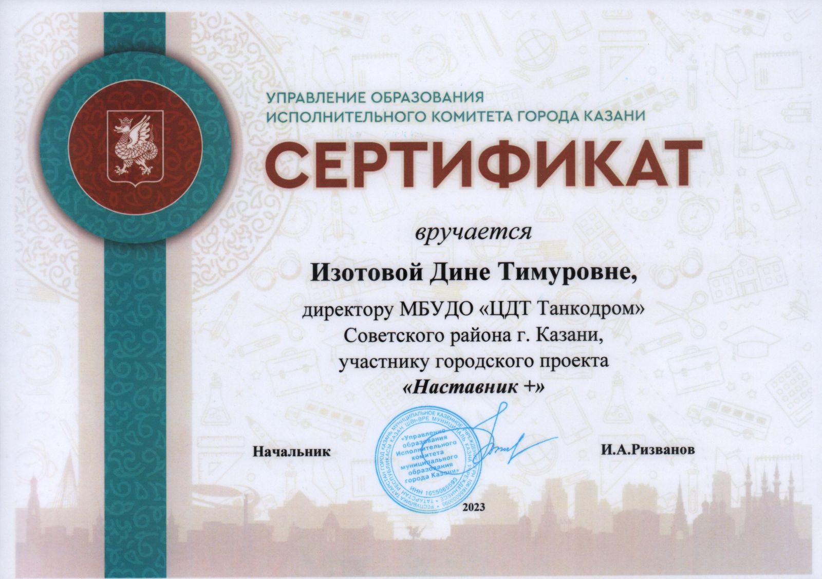 30 марта 2023 г. в Международной школе Унискул состоялось подведение итогов городского проекта "Наставник +" для руководителей образовательных организаций г. Казани, назначенных в последние два года и вручение сертификатов начальником Управления образования Ризвановым Иреком Асафовичем.