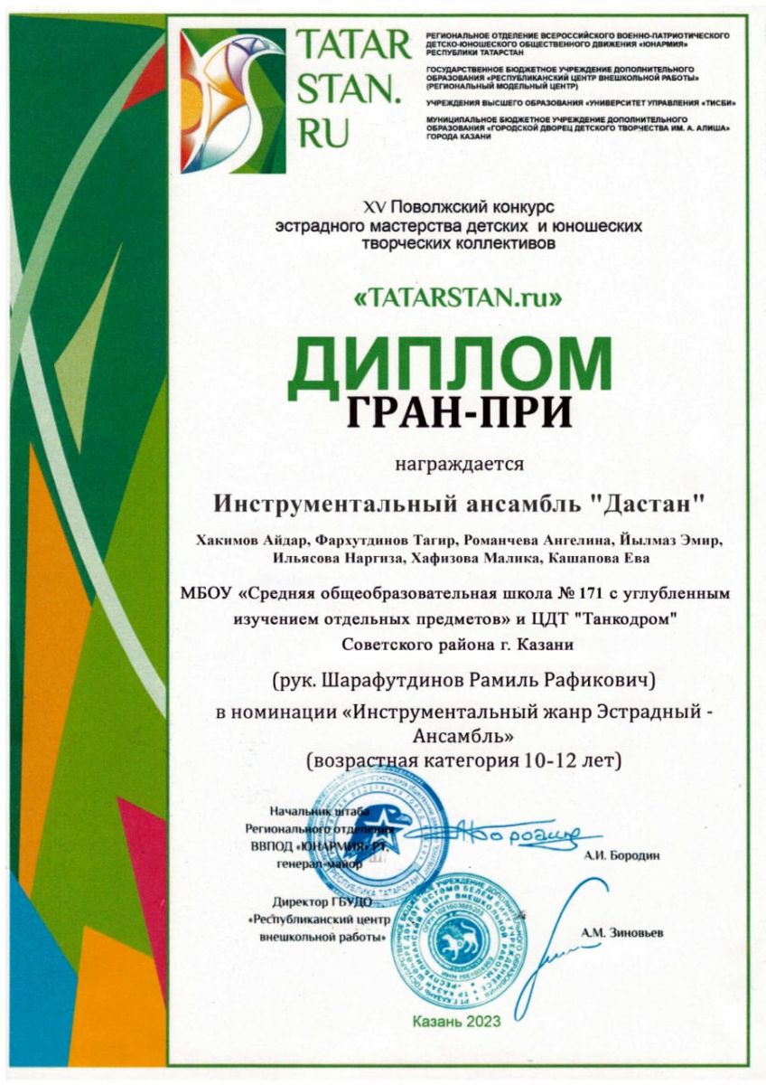 Поздравляем инструментальный ансамбль "Дастан" (рук. Шарафутдинов Р.Р.) ЦДТ "Танкодром", занявший диплом ГРАН-ПРИ на XV Поволжском конкурсе эстрадного мастерства детских и юношеских творческих коллективов.