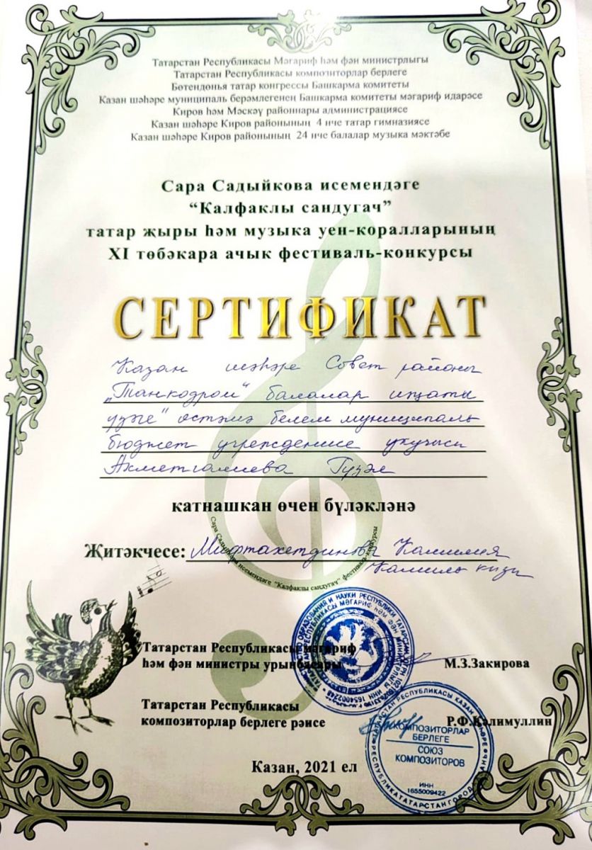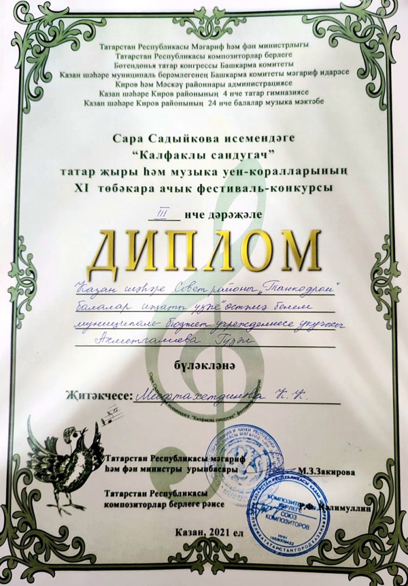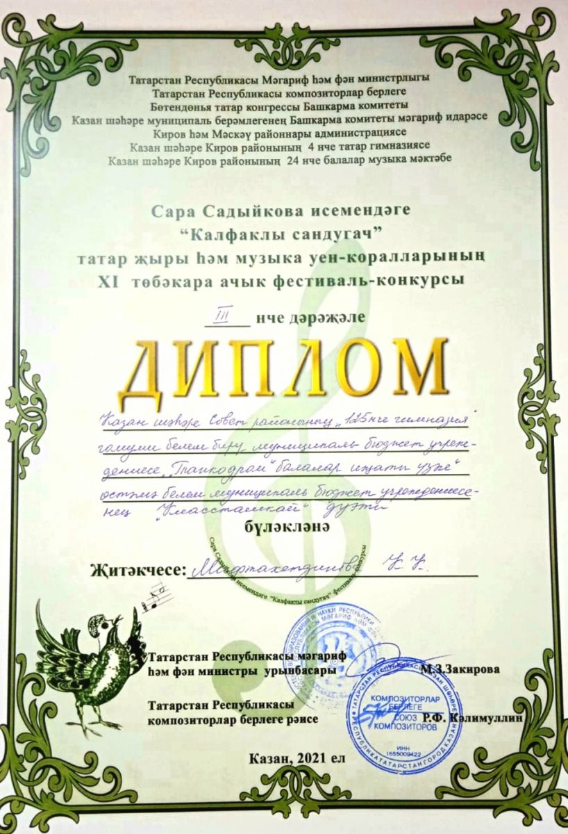 Поздравляем победителей Межрегионального вокального конкурса "Калфаклы сандугач", посвящённый 115-летию татарской певицы и композитора Сары Садыйковой, дуэт "Классташкай" и Ахметгалиеву Гузель (руководитель Мифтахутдинова К.К. "ЦДТ Танкодром")!