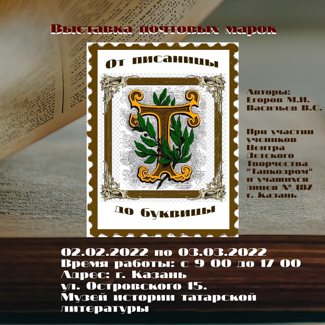 С 2.02.2022 - 3.03.2022г. в Музее истории татарской литературы будет проходить "Выставка почтовых марок" при участии учащихся ЦДТ "Танкодром".
