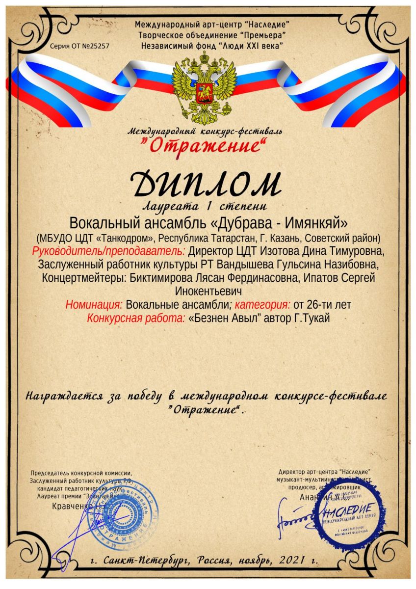 Поздравляем победителя Международного конкурса-фестиваля "Отражение" вокальный ансамбль "Дубрава-Имянкяй"!