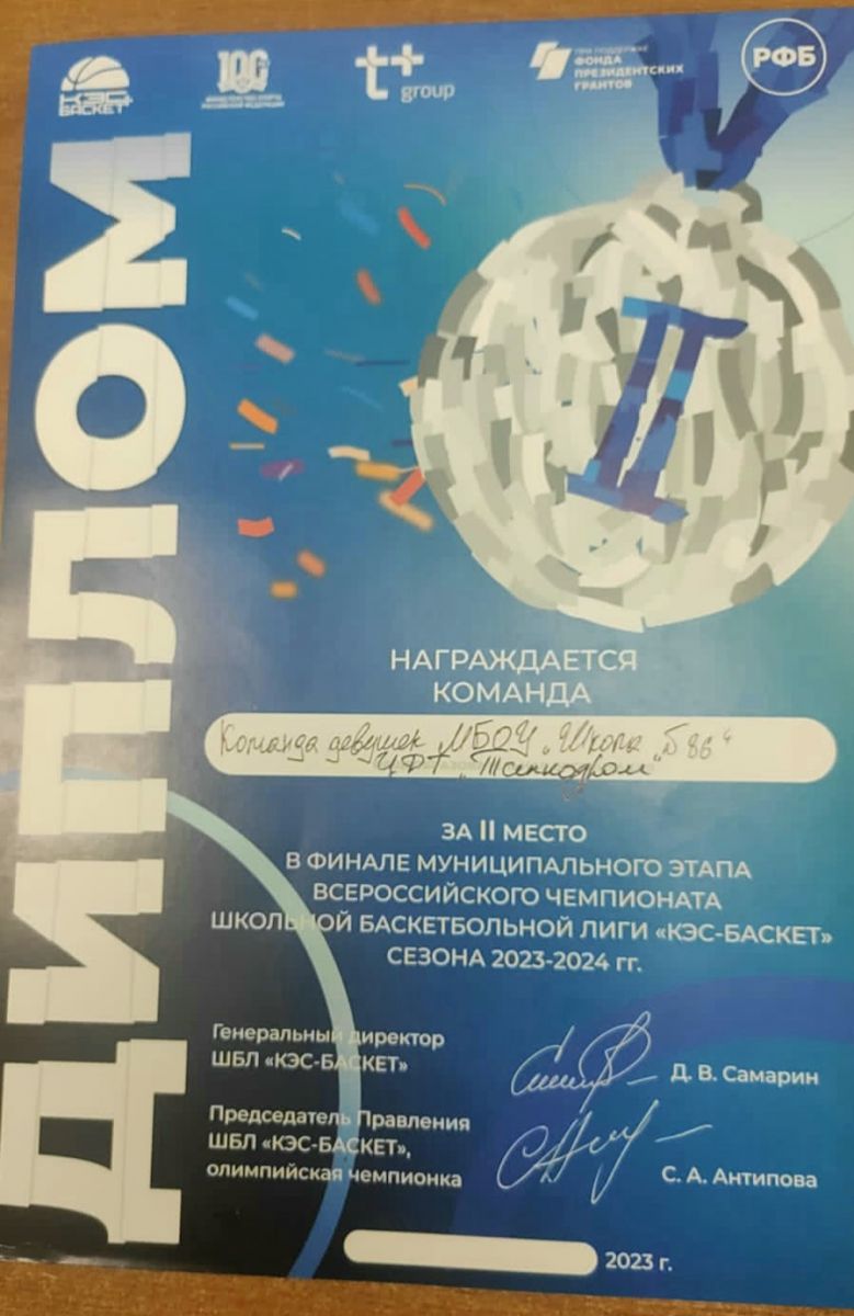 16 ноября 2023 г. состоялся финал муниципального этапа Всероссийского чемпионата школьной баскетбольной лиги "КЭС-БАСКЕТ" сезона 2023-2024 учебного года среди команд девушек. Команда объединения "Баскетбол" ЦДТ "Танкодром" выиграла II место в соревнованиях среди команд школ Советского района (рук.Киямов А.А.). Поздравляем!