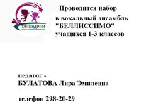 - Вокальный ансамбль «Белиссимо» - для детей от 7 до 10 лет;