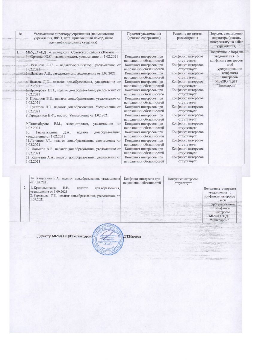 Уведомления о конфликте интересов в ЦДТ "Танкодром" 2020-2021 уч.г
