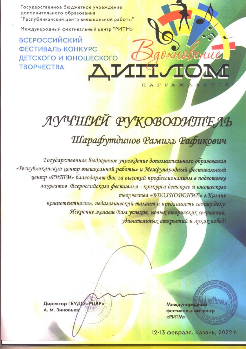 Специальным дипломом "Лучший руководитель" награжден педагог ЦДТ "Танкодром" Шарафутдинов Рамиль Рафикович.