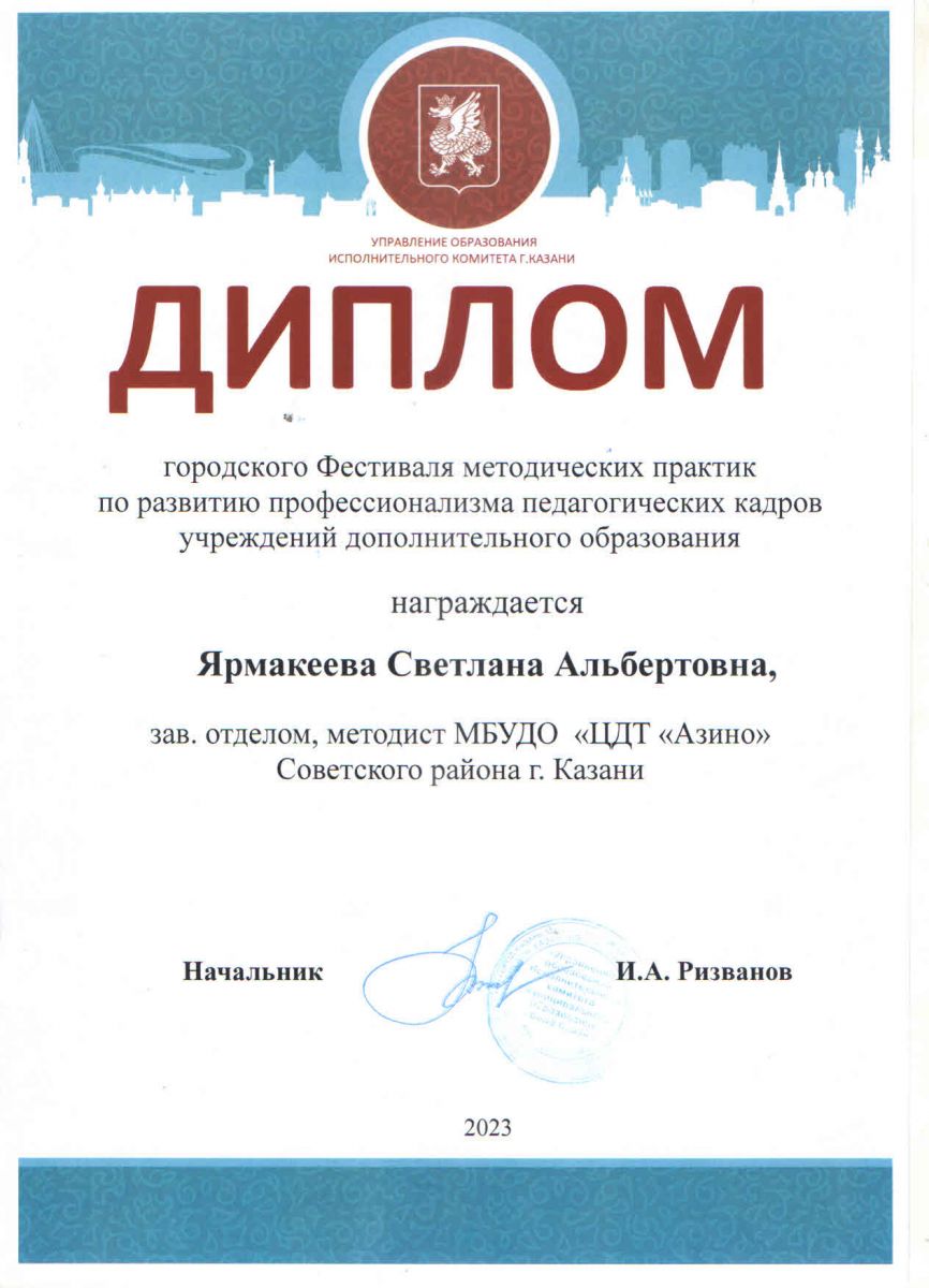 20 декабря на базе ЦДТ «Азино» состоялся финал IV городского Фестиваля методических практик по развитию профессионализма педагогических кадров учреждений дополнительного образования. Организаторами Фестиваля выступили Информационно-методический отдел Управления образования г. Казани и Центр детского творчества «Азино» Советского района.