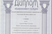 По итогам общероссийского конкурса "Лучший современный урок (занятие) в учреждениях ДО" педагог СДЮТиЭ, Гурьева Вера Сергеевна, награждена дипломом I степени за разработку социального проекта в 1-4 классах на тему "Сказка о правилах дорожного движения". ПОЗДРАВЛЯЕМ!