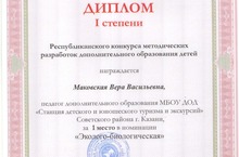 Педагог дополнительного образования Маковская Вера Васильевна награждена дипломом 1 степени в Республиканском конкурсе методических разработок дополнительного образования детей в номинации "Эколого-биологическая".