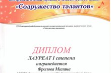 Поздравляем лауреатов VII Международного фестиваля-конкурса инструментальной музыки "Содружество талантов" Фролову Милану (пр.Шакирова Е.Н., концертмейстер Никифорова Е.Е.) - Лауреат I степени (младшая группа), Гатину Нурию (пр.Шакирова Е.Н., концертмейстер Никифорова Е.Е.) - Лауреат I степени (старшая группа), Кирюхина Сергея (пр.Марина Т.А.) - Лауреат III степени.