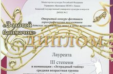 7 февраля в концертном зале Казанского государственного университета культуры и искусств (Оренбургский тракт, 3) начал работу открытый конкурс-фестиваль хореографических коллективов детских музыкальных школ и школ искусств «Золотой башмачок». За звание лауреатов и дипломантов боролись около 25 коллективов из детских музыкальных школ и детских школ искусств столицы Татарстана.Более 400 участников представили народные, эстрадные, современные танцы, а так же вокально-хореографические композиции.В состав жюри вошли известные балетмейстеры, хореографы, заслуженные деятели искусств Республики Татарстан. Поздравляем участников хореографических коллективов ДШИ №4 с успешным выступлением : "Сладкоежки" Лауреат III степени, "ЛЭВИС"Лауреат III степени, "Тараторки" Лауреат III степени, "Карусель"Дипломант II степени, "Happy time"Дипломант II степени, "Иллюзия" Дипломант III степени, "Кубик рубик" Дипломант II степени .