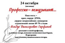 В жизни детской школы искусств №4 родилась еще одна хорошая традиция: встречи с интересными людьми, которые не выбрали музыку своей профессией, но стали мастерами своего дела в других профессиональных сферах. Первая такая встреча состоялась 24-го октября: нашим гостем стал известный детский хирург, врач ДРКБ, а также бард из золотой плеяды шестидесятников Ильдус Вильсорович Гирфанов.