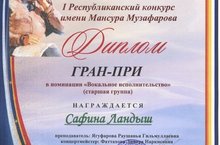 20 ноября в ДМШ №18 прошел I Республиканский конкурс им. М.Музафарова.Ученица нашей школы вокалистка Сафина Ландыш класс преподавателя Ягуфаровой Р.Г. (концертмейстер Фаттахова Д.Н.) завоевала высшую награду конкурса Гран-При. Поздравляем!