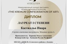 30 августа состоялся Международный конкурс-фестиваль музыки, культуры и искусства "THE KREMLIN CONFEDERATION OF ART". Кастилльо Инара (преподаватель Карпова О.А., концертмейстер Хамидов Р.Р.) - Лауреат 1 степени. Поздравляем!!!