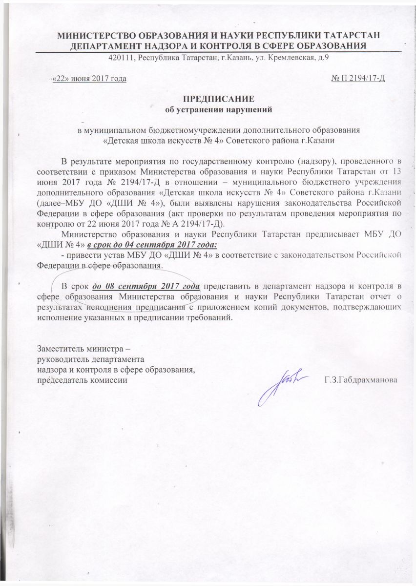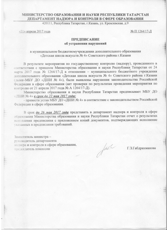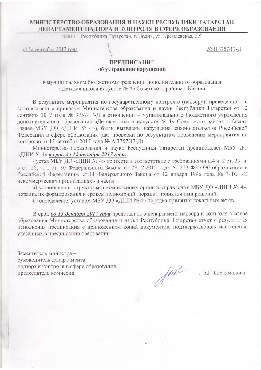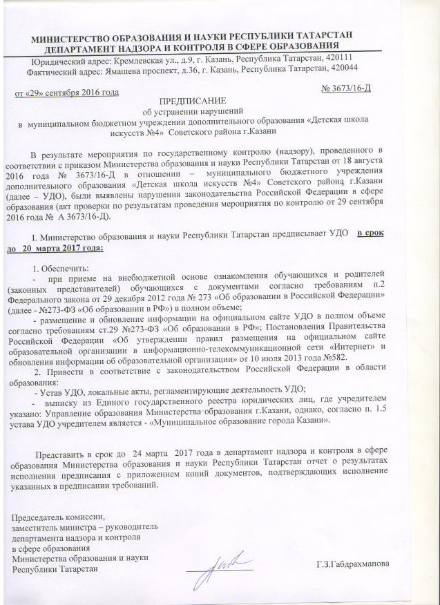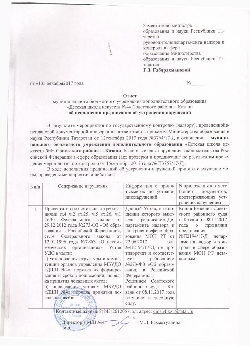 Отчет ДШИ№4 об исполнении предписания об устранении нарушений
