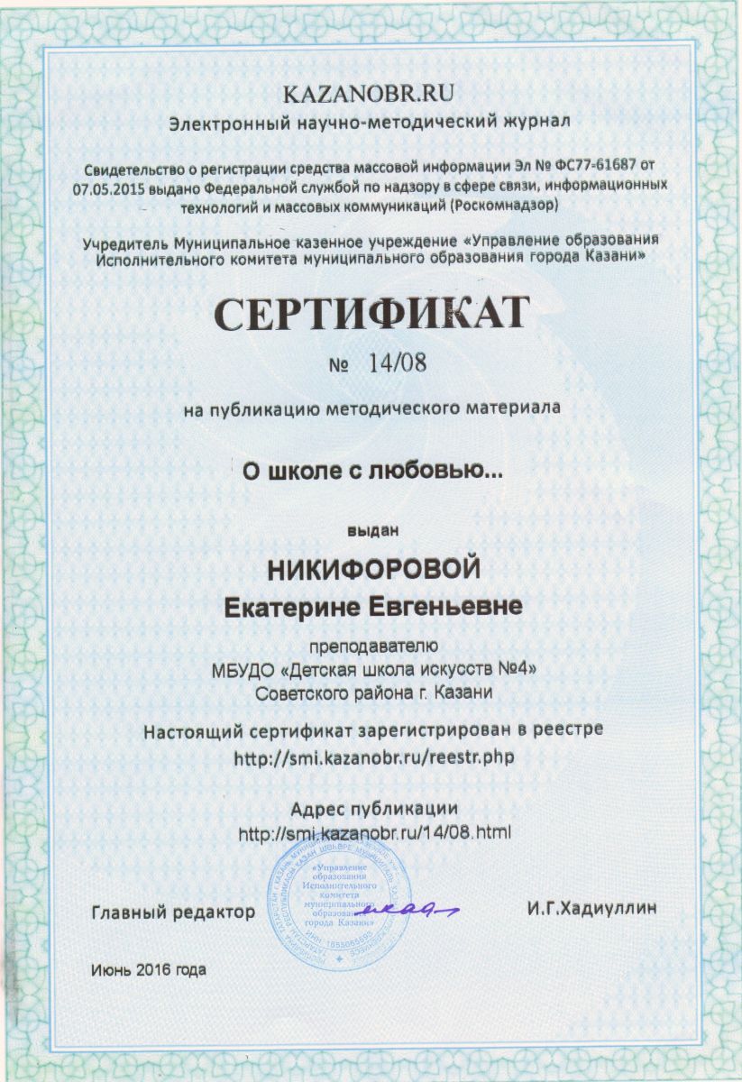 1.Статья Никифоровой Е.Е. в электронном научно-методическом журнале Kazanobr.ru выпуск №14 июнь 2016 http://smi.kazanobr.ru/14/08.html Сертификат Никифоровой Е.Е.