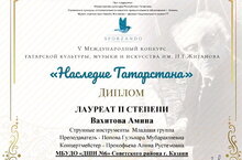 Вахитова Амина, первоклассница класса Поповой Гульнары Мубаракшевны, стала лауреатом 2 степени в V Международном конкурсе татарской культуры, музыки и искусства им. Назиба Гаязовича Жиганова «НАСЛЕДИЕ ТАТАРСТАНА», организованным фондом Сфорцандо и прошедшем 9 марта в КДК имени Ленина.