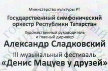 19 и 20 октября на сцене ГБКЗ им. С.Сайдашева прошел III музыкальный фестиваль "Денис Мацуев у друзей". Фестиваль приурочен к 50-летию Александра Сладковского. В программе фестиваля приняли участие Государственный симфонический оркестр Республики Татарстан под управлением Александра Сладковского и Денис Мацуев (фортепиано), звучала музыка П.И.Чайковского и С.Прокофьева. Поздравляем Александра Витальевича с 50-летием желаем здоровья и творческих успехов.