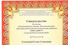Педагог нашей школы Усенкова Елена Семёновна приняла участие в Республиканском конкурсе методических работ переподавателей музыкально-теоретических дисциплин ДМШ и ДШИ РТ "Созвездие педагогических идей", представив на конкурс работу "Музыкальная грамота для учащихся и их родителей".
