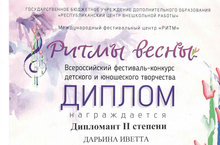 Дарьина Иветта (рук. Гудошникова М.А.) приняла участие во Всероссийском фестивале-конкурсе детского и юношеского творчества "Ритмы весны". По итогам конкурса получила диплом дипломанта 2 степени. Поздравляем! Желаем дальнейших творческих успехов!
