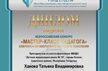 Педагоги нашей школы Ханова Т.В. и Гудошникова М.А. приняли результативное участие во Всероссийском конкурсе "Мастер- класс педагога", получив диплом лауреата за педагогическую авторскую разработку "Воспитание национальной культуры как средство формирования духовно-нравственной культуры учащихся в системе дополнительного образования" и "Обучение и воспитание в старших классах ДМШ". Поздравляем! Желаем дальнейших творческих успехов!