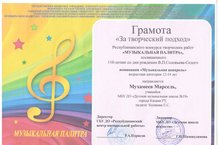 Мухамеев Марсель (рук. Усенкова Е.С.) принял участие в Республиканском конкурсе творческих работ "Музыкальная палитра". По итогам конкурса получил Грамоту "За творческий подход" в номинации "Музыкальная акварель". Поздравляем! Желаем дальнейших творческих успехов!