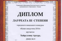 Учащийся нашей школы, Хайруллин Артур принял участие в городском вокальном конкурсе "Казан Сандугачы". По итогам конкурса получил диплом лауреата 3 степени (рук. Григорьева М.Н.). Поздравляем! Желаем дальнейших творческих успехов!