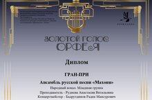 Ансамбль русской песни "Махоня" получил Гран-при Международного конкурса вокалистов и чтецов "Золотой голос Орфея", который состоялся 26 февраля 2022 года. Дипломом "Лучший преподаватель" была награждена Руднева А.В., руководитель ансамбля, дипломом "Лучший концертмейстер" был награждён Бадрутдинов Р.М., концертмейстер ансамбля. Желаем дальнейших творческих успехов и новых побед!