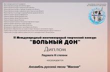 Поздравляем Ансамбль русской песни "Махоня" (руководитель: Руднева А.В., концертмейстер: Бадрутдинов Р.М.) - Лауреата III степени II Международного многожанрового творческого конкурса "Вольный Дон"! Желаем дальнейших творческих успехов и новых побед!
