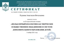 3 ноября 2021г. преподаватель сольного пения Руднева А.В. приняла участие во II педагогических чтениях “Фольклорный коллектив как творческое и общественное объединение в системе дополнительного образования детей” с докладом на тему: «Народное вокальное творчество как средство коррекции поведения детей с синдромом дефицита внимания и гиперактивностью». Организаторы мероприятия: Министерство образования и науки Республики Татарстан, ГАОУ ДПО «Институт развития образования Республики Татарстан», ФГБОУ ВО «Казанская государственная консерватория имени Н.Г.Жиганова», ФГБОУ ВО «Казанский государственный институт культуры», Управление образования Исполнительного комитета муниципального образования г. Казани, МБУДО «Детская музыкальная школа № 24» Кировского района г.Казани, Татарстанское региональное отделение общероссийской общественной организации «Российский фольклорный союз», Городское методическое объединение руководителей фольклорных ансамблей и ансамблей народной песни при УО ИКМО г. Казани. В мероприятии свои доклады представили 15 преподавателей из Казани, Набережных Челнов, Альметьевска, Кайбицкого и Лаишевского районов РТ. Всего на платформе ZOOM в педагогических чтениях участвовало более 50 преподавателей и воспитателей.