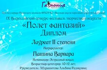 Поздравляем обучающихся класса преподавателя Абдрашитовой Альбины Радиковны с успешным выступлением в IX Всероссийском конкурсе-фестивале творчества и искусств «Полет фантазий»!