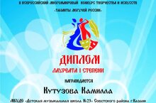 Поздравляем Кутузову Камиллу (преподаватель: Уварова Лариса Рудольфовна) - Лауреата I степени II Всероссийского многожанрового конкурса творчества и искусств "Таланты могучей России"! Желаем дальнейших творческих успехов и новых побед!